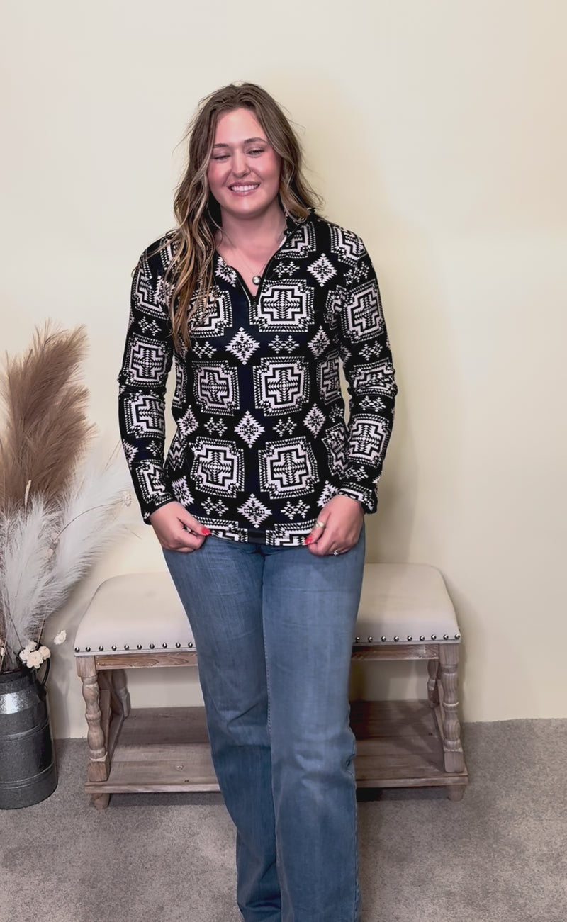 This Down in the Hills quarter zip Pullover boasts a cool cream on black all over aztec print, bringing on an unbeatable combination of style and warmth, a cool weather must-have!