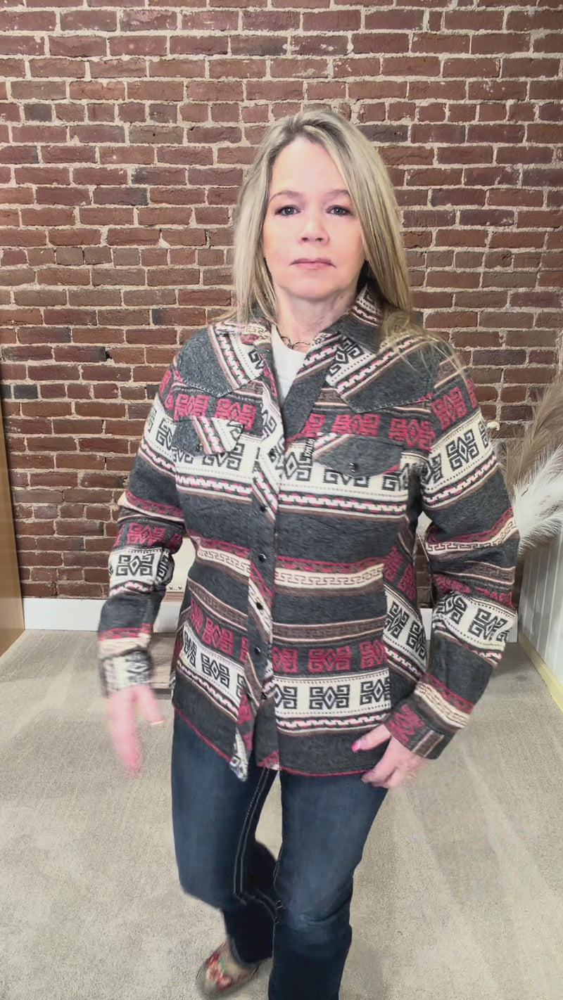 Step up your Western game with this heavy flannel women’s performance shirt featuring a stunning Aztec pattern in greys, browns, and red. Complete with snap front closure, chest pockets, and princess seams, this shirt combines rugged performance with a flattering fit—perfect for all your Western adventures!