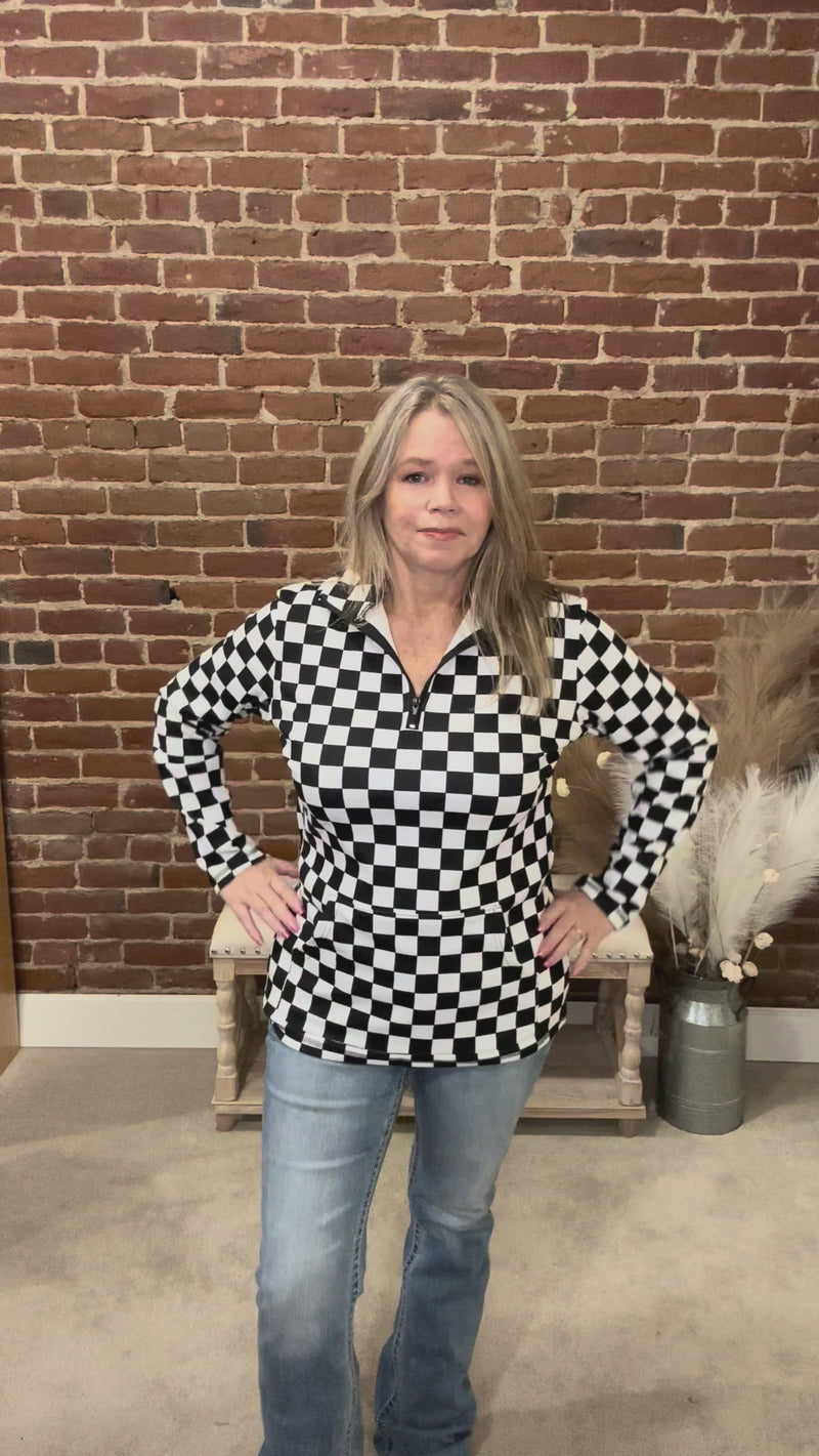 This Black & White Check Quarter-Zip Pullover is the perfect mix of sporty and chic. With its bold checkered pattern, front kangaroo pocket, and easy quarter-zip design, it’s made for everything from game day vibes to casual coffee runs. Fleece lined and medium weight — this pullover is a win no matter how you style it.